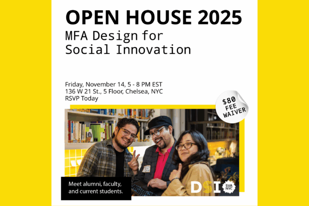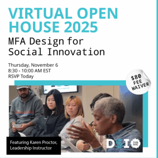 Join our Virtual Open House to discover more about DSI and SVA. Participate Karen Proctor, beloved, legacy faculty, will lead a hands-on activity to offer an in-depth look at the DSI Leadership course. $80 application fee waiver. Register to hold your space!