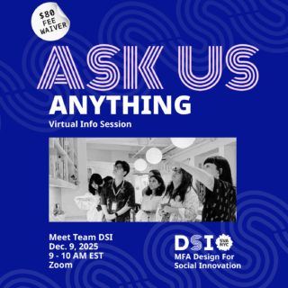 What do you care about? Drop in to our Virtual Info Session and “Ask Us Anything”! Talk with chair, Miya Osaki. the DSI team, and *surprise* DSI guests who will open the floor to any and all questions about social design, grad school, and the future. Receive an $80 application fee waiver.