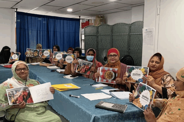 The Sapna Rannaghor Cookbook Project, co-designed in the English for Speakers of Other Language (ESOL) classes at Sapna NYC with emergent bilingual Bangladeshi immigrant women, centers these cultural assets and native Bangla language skills, using food and recipes as vehicles for building English proficiency and community.