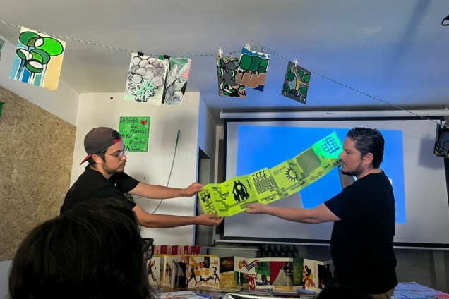 Highlights from the exhibition include Hector Ruiz’s (MFA DSI ’25) COMPA, a collaboration with communities on both sides of the US and Mexican border. A glyph system was created and later programmed in a digital font that aims to reflect on what it means to live and travel in borderlands with two languages, as well as two political and economic systems. Xinlu Ciel Chen’s (BFA 2022 Illustration; MFA 2024 Illustration as Visual Essay) Echo in Blue (2024) is a frame-by-frame animation about giving and returning. A girl goes on a unique journey chasing her cat, culminating in the discovery of the truth and purpose behind it all. DW Zinsser’s (MFA Art Practice) A Beautiful Broth (2024) explores the resilience of the queer body through large-scale drawings that blend gestural watercolor painting and meticulous stippling. They create genderless, ageless forms that are both unformed and decaying; their work depicts piles of trash, plastic totems, and grotesque characters, celebrating excess and creating a cluttered shrine to grief.